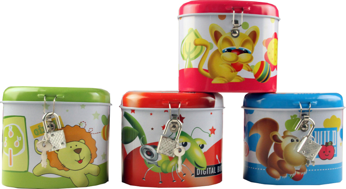 Rheita Metall-Spardose, ovale Form, 4 verschiedene Motive sortiert, für die Klassenkasse