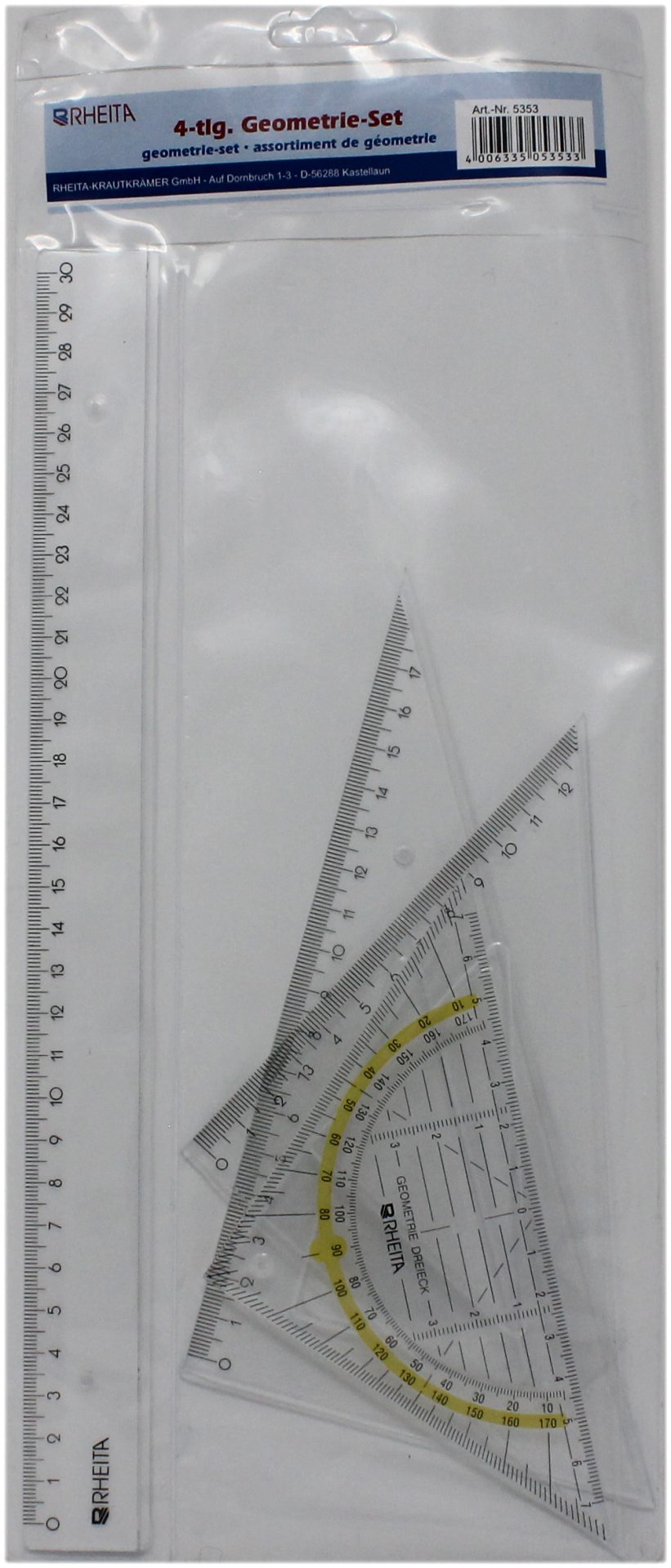 Rheita Zeichenset 4tlg, transparent, bestehend aus Lineal: 30 cm, rechter Winkel: 30/60°,rechter Winkel: 45°,Geodreieck: 16 cm